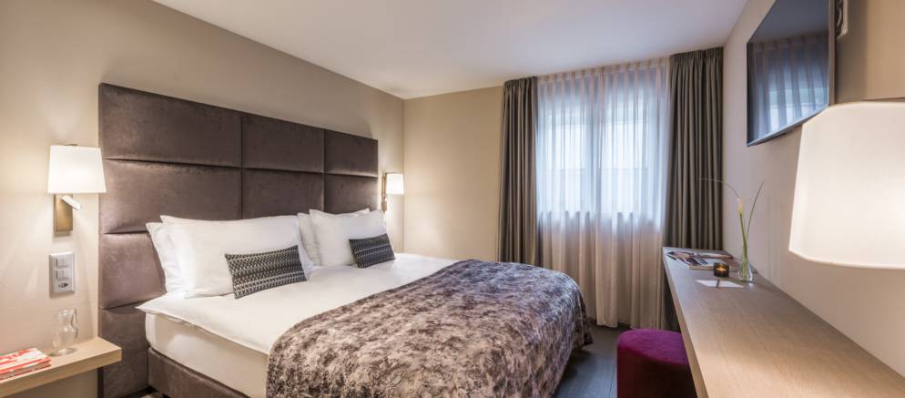 Twin or double bed with TV, desk, terrace access and en-suite bathroom.
