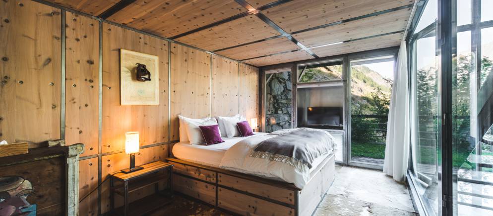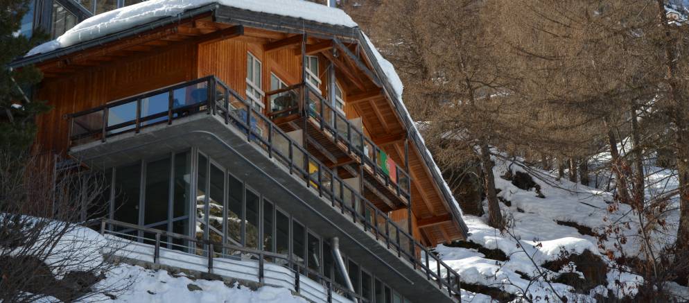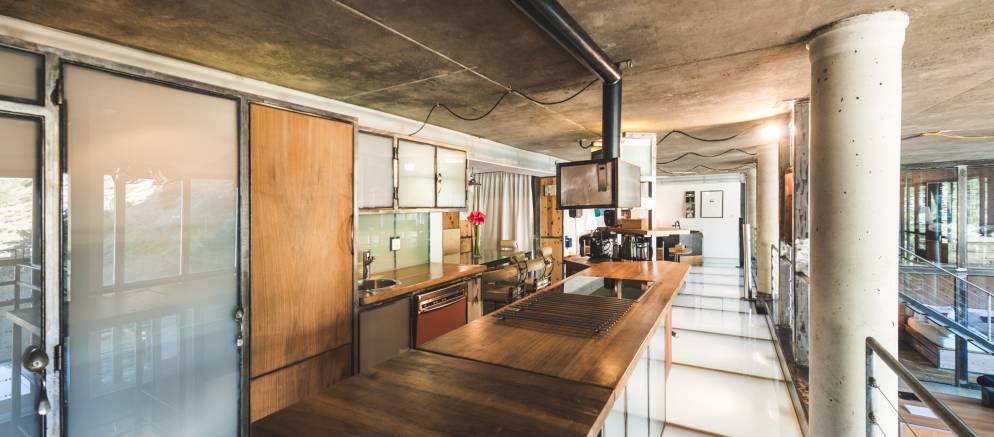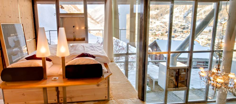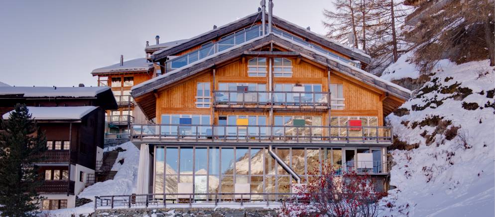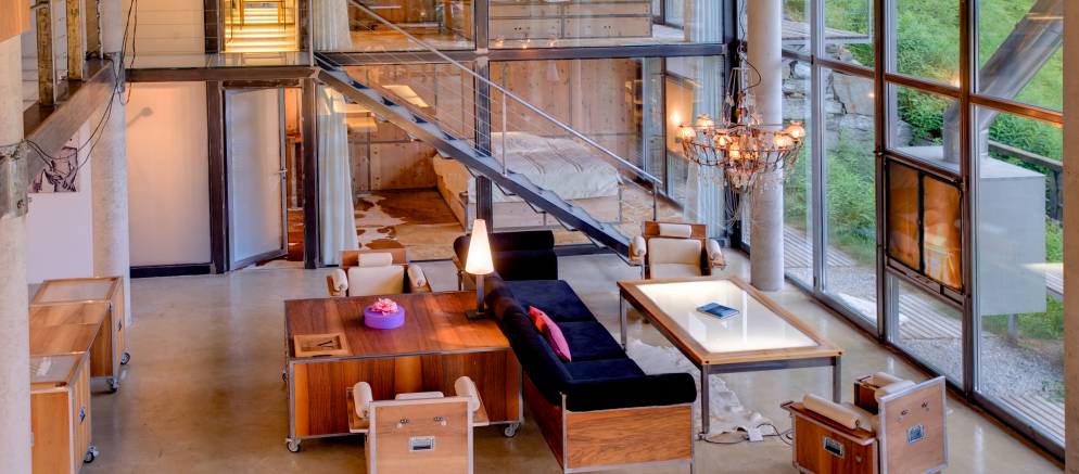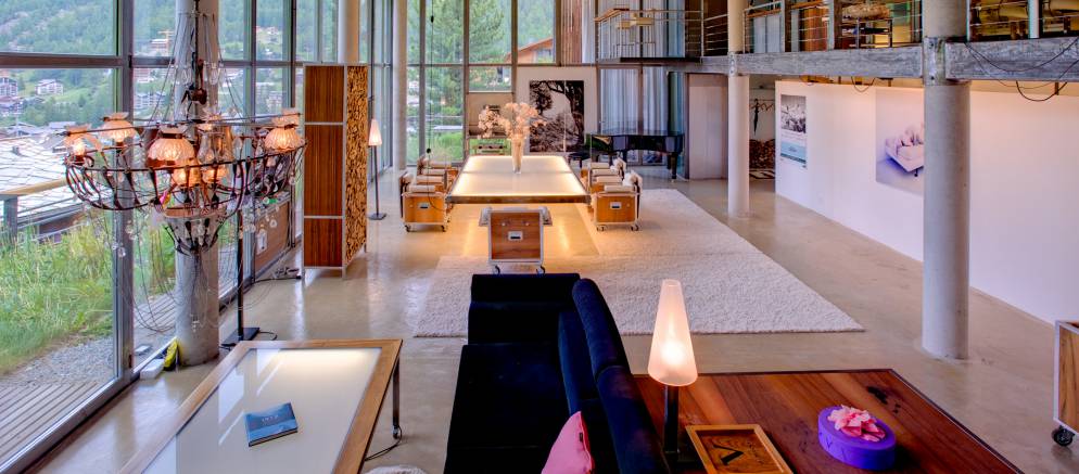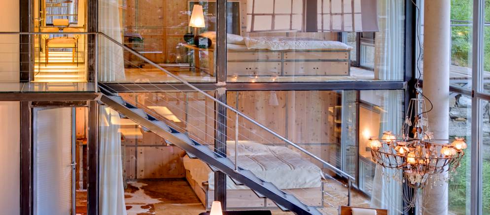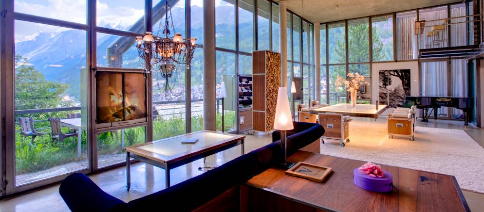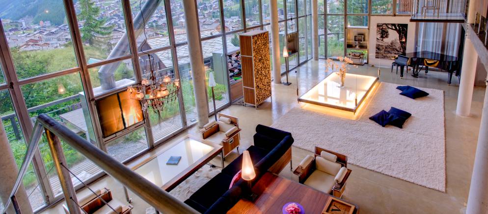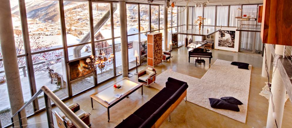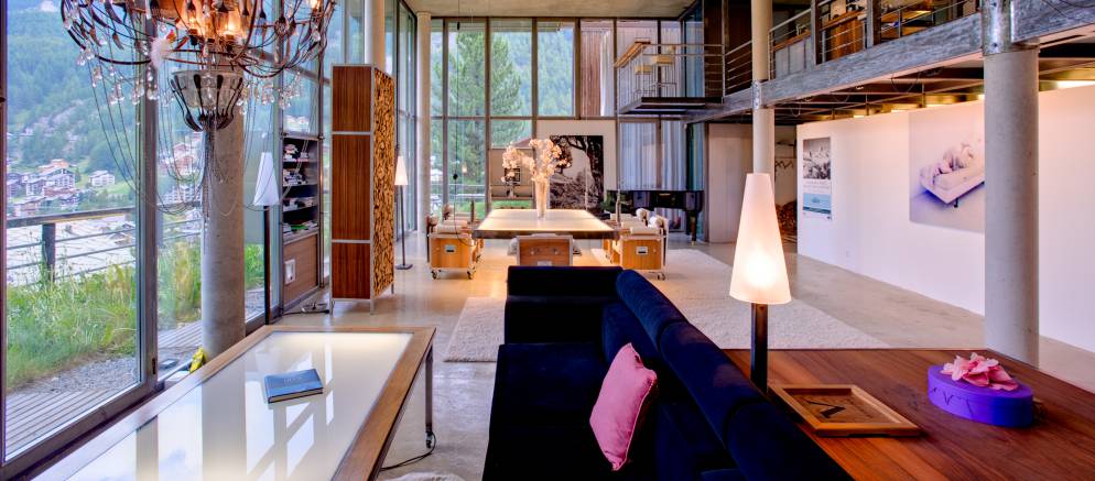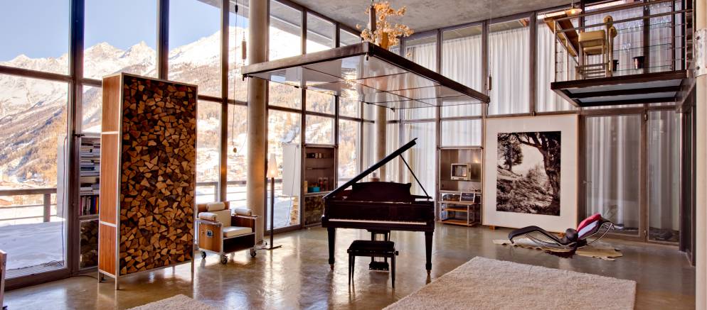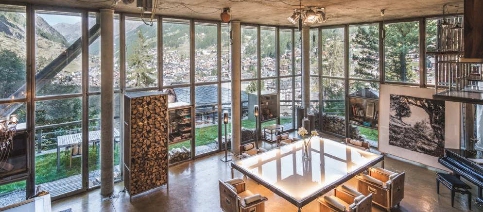 This is without doubt the most spectacular property in Zermatt, if not the Alps. A huge 300m2 Manhattan style loft set in a wooden chalet in the Swiss Alps; it combines acres of glass, steel, textured concrete and wood in a unique symphony of fusion architecture created by local star designer Heinz Julen.