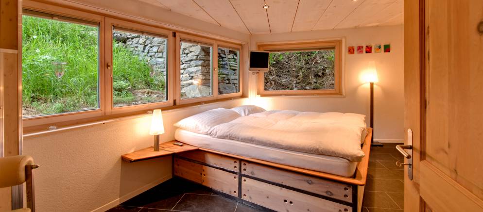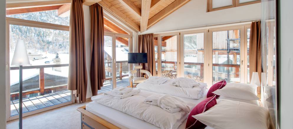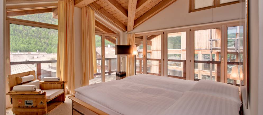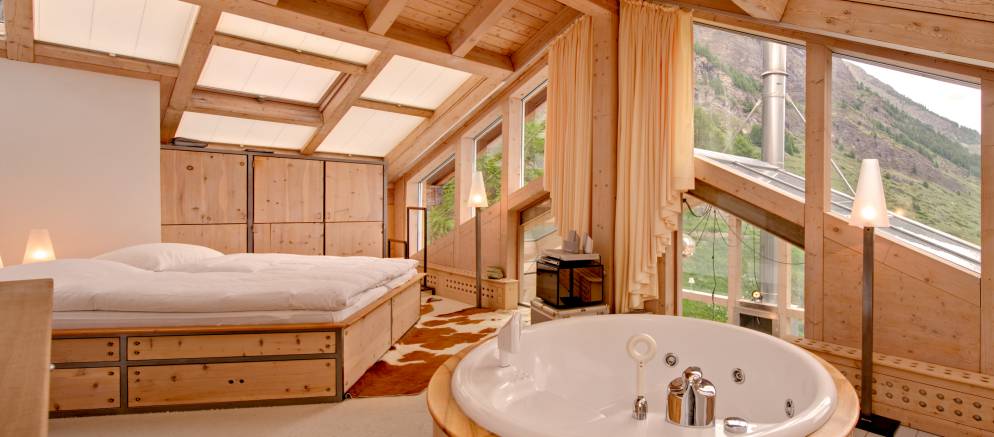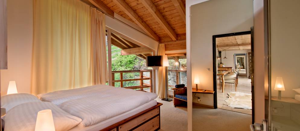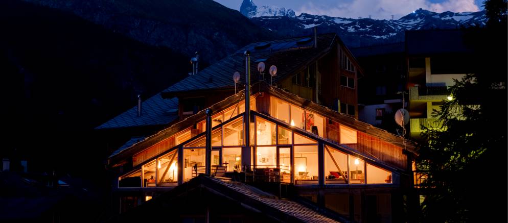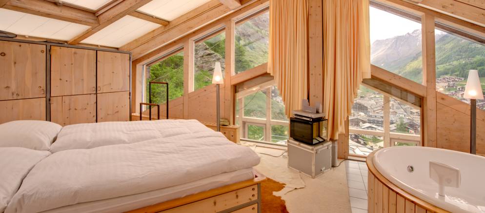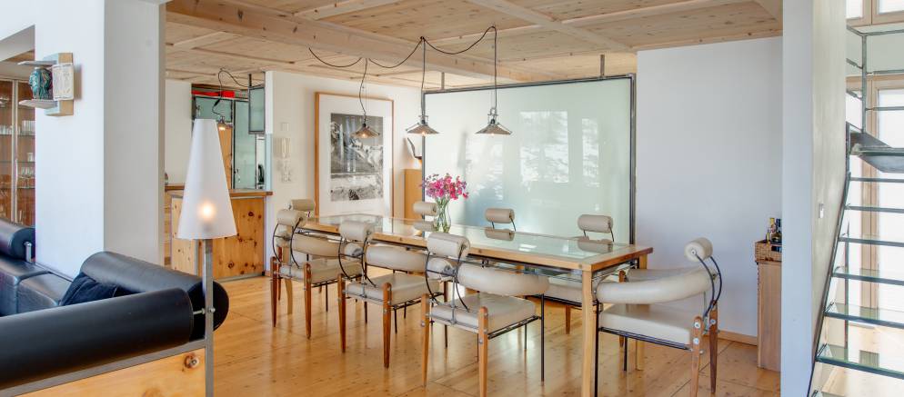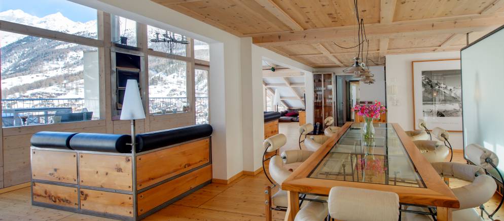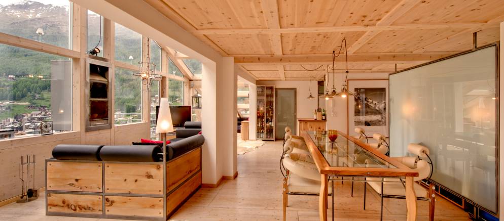 Zermatt’s internationally acclaimed architect, Heinz Julen, designed this extraordinary double-level 260m2 Penthouse which is set above The Loft. With concepts such as a fireplace nesting in the middle of the living-room window, and original hand-made furniture, including Julen’s famous chandeliers and chairs, it has featured in several designer magazines.
