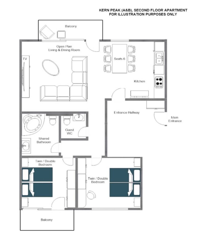 This apartment has two attractive twin/double bedrooms, one of which has a balcony. The two bedrooms share a large bathroom that has a wonderful corner bath tub, perfect for soaking weary muscles. There is a separate shared toilet too.