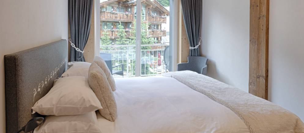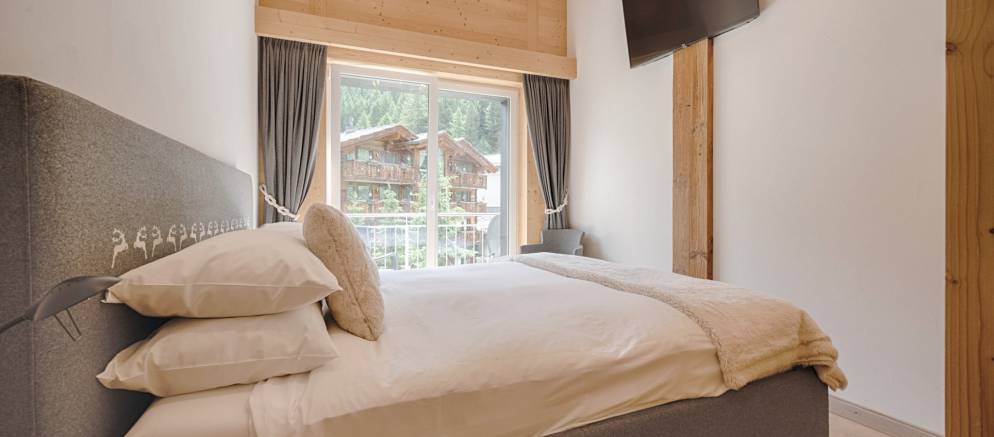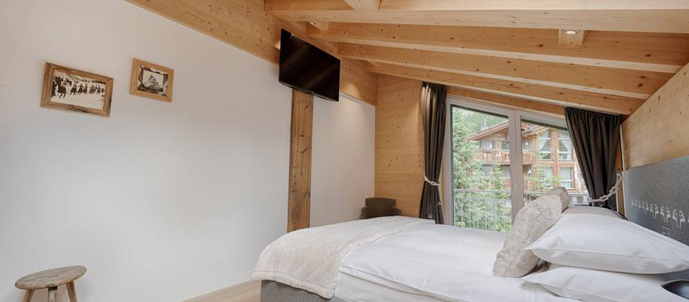 Tuftra Penthouse 4 in Zermatt sleeps 4 guests in 2 double/twin en suite bedrooms (one bedroom can also be made up as a triple bedroom for an additional fifth guest). Both bedrooms are en suite and equipped with bath or shower, one bathroom also has a steam shower. Each bedroom has a flat screen TV for reception of satellite TV.